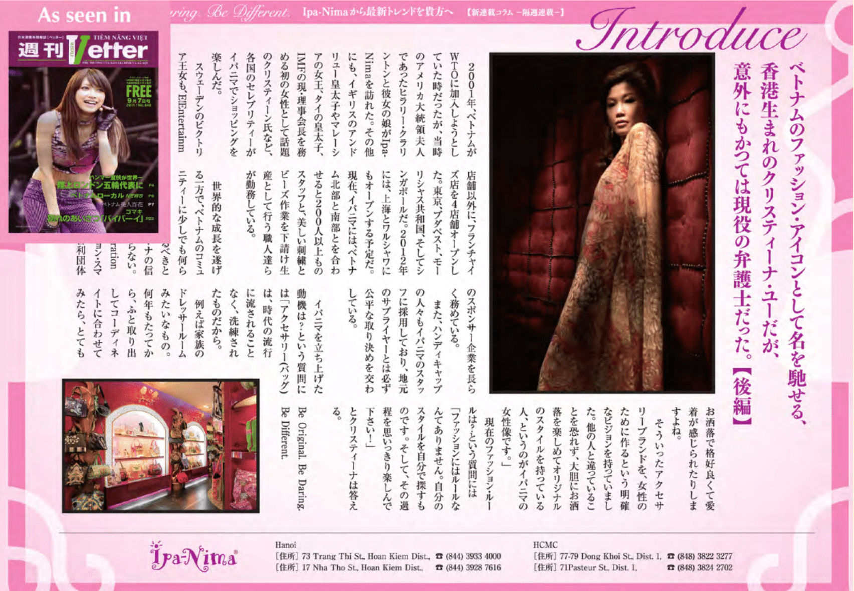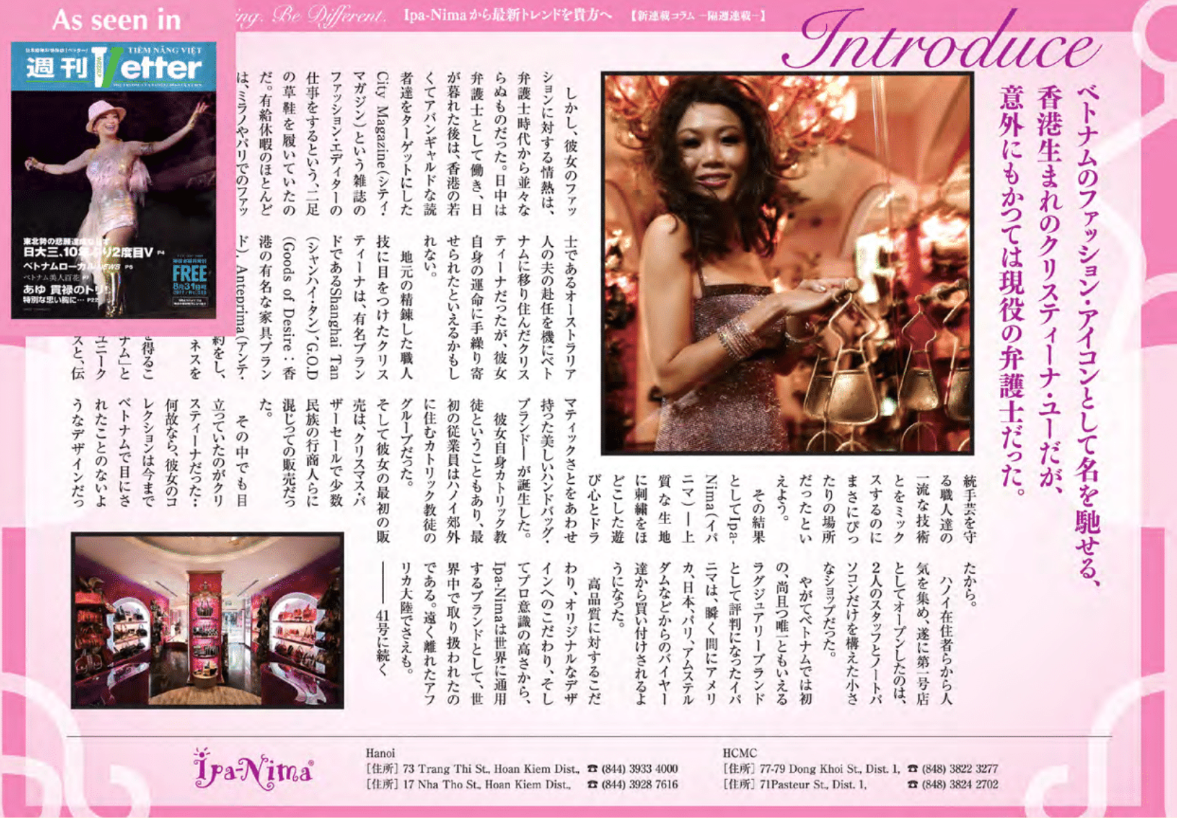 Japan has always been a place where fashion is in the center of the interest. With the support from many editors from the biggest titles, IPA-NIMA has been promoted as a brand to carry, with trendiest bags.