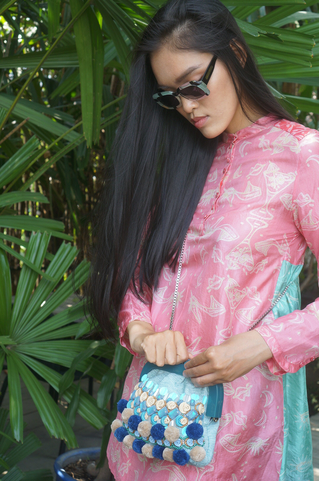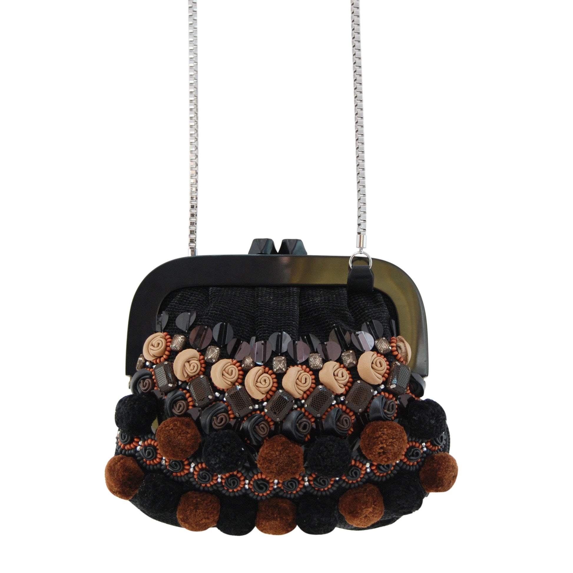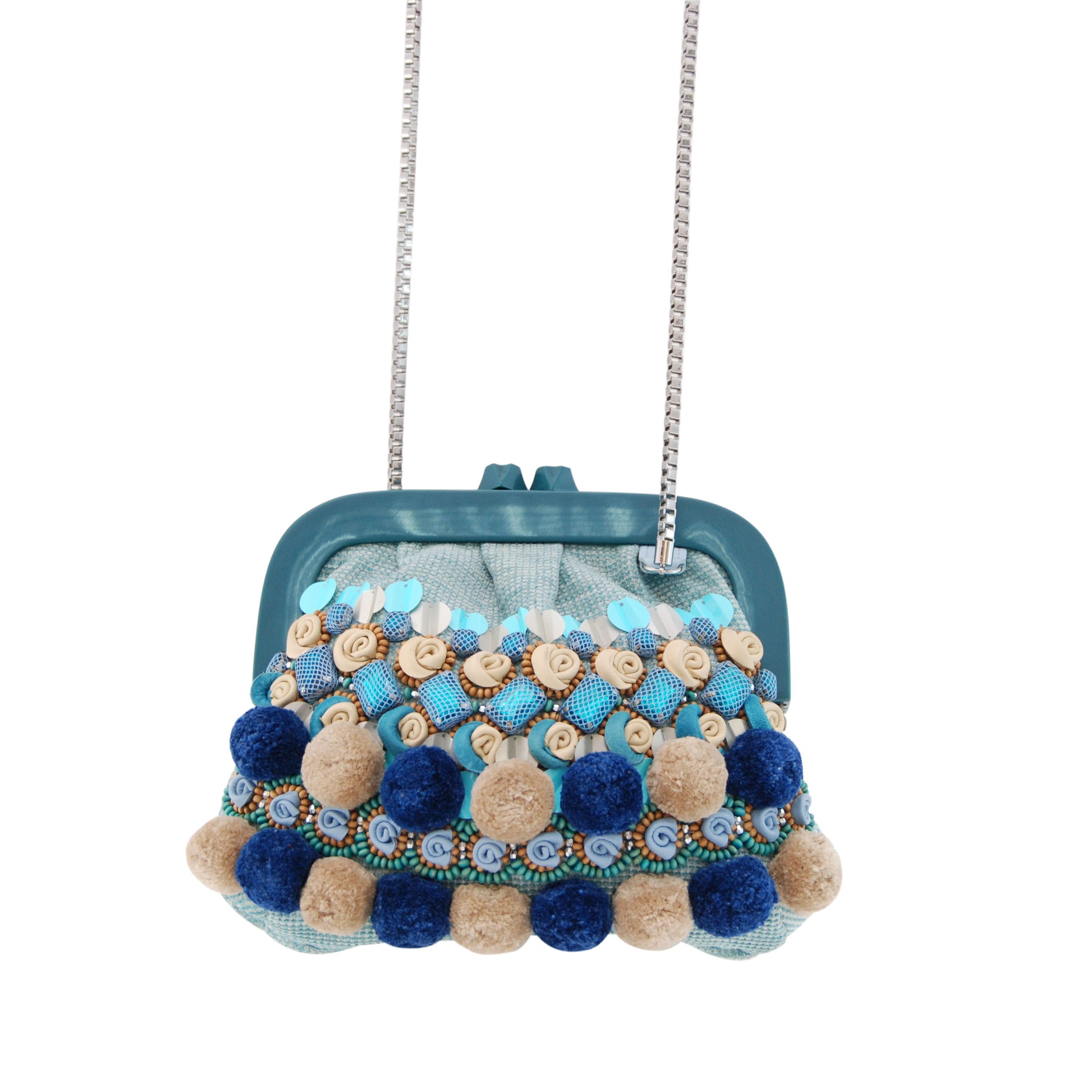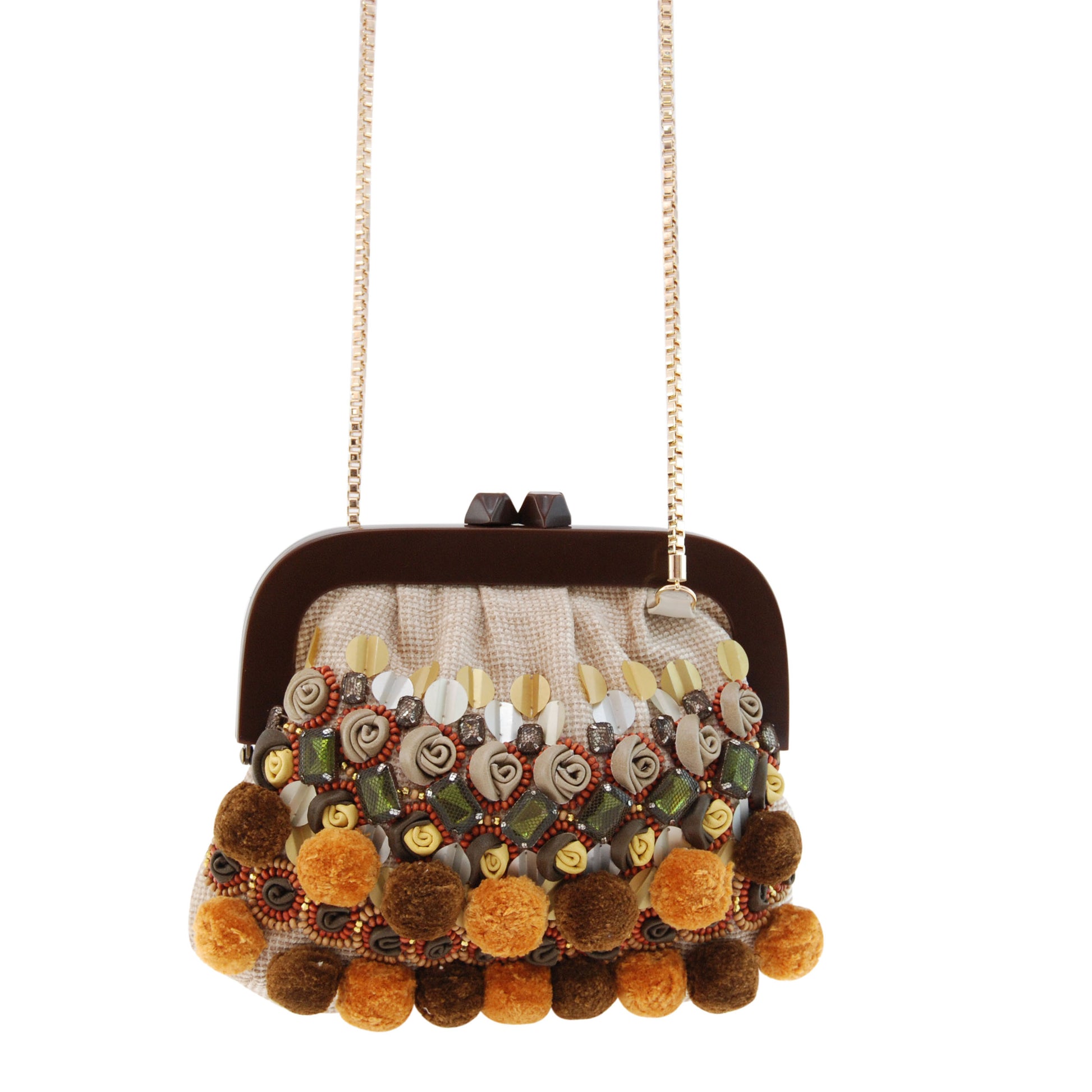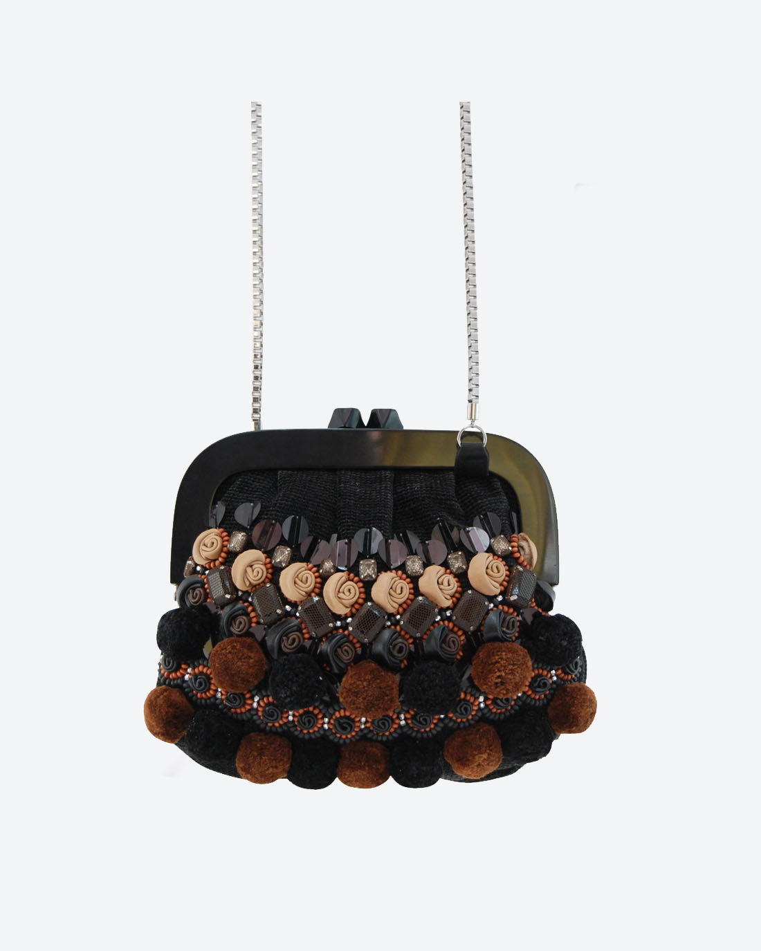 Our Ariana represents our revered meticulous craftsmanship best - created with hand-rolled leather florets, sequins, and rhinestones covered in mesh ( to prevent the prongs from damaging your clothes) ~ the embellishment is intricate and enchanting. The bi-coloured poms poms give the bag a great flair and will easily uplift your ensembles.