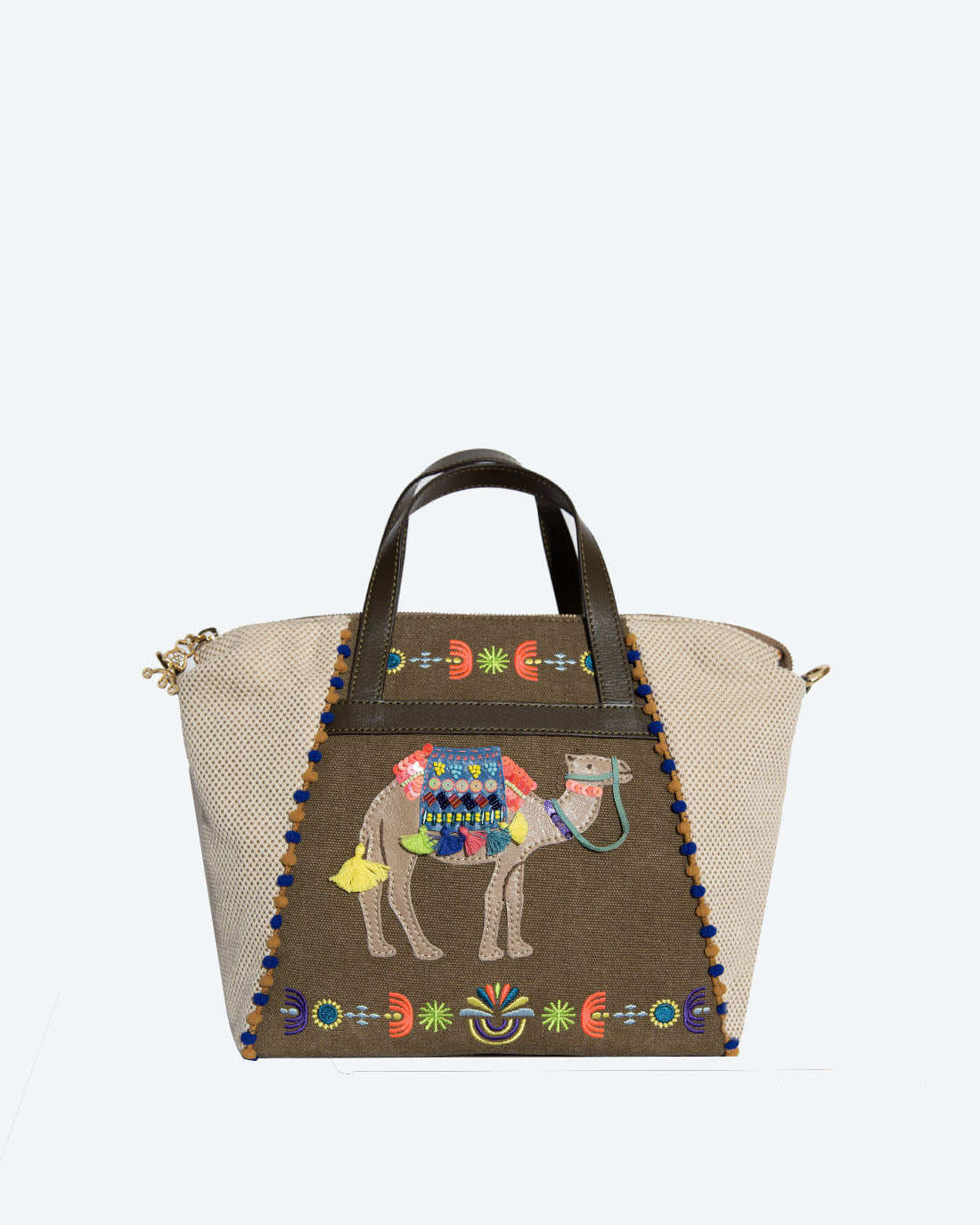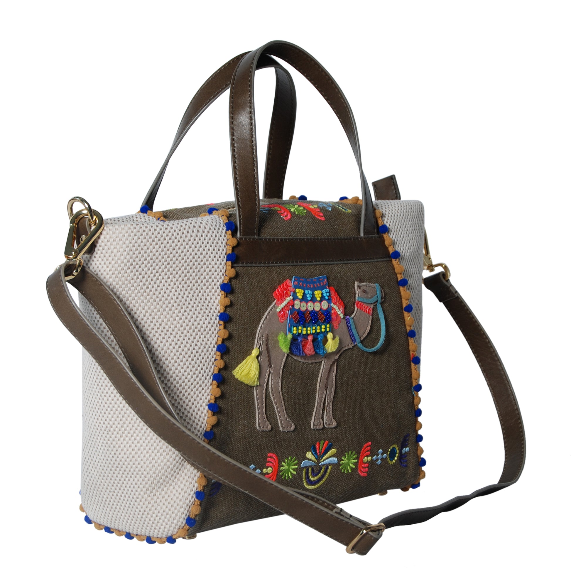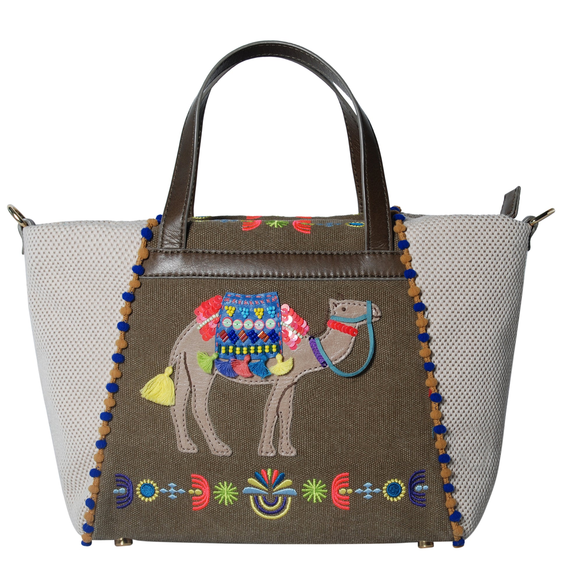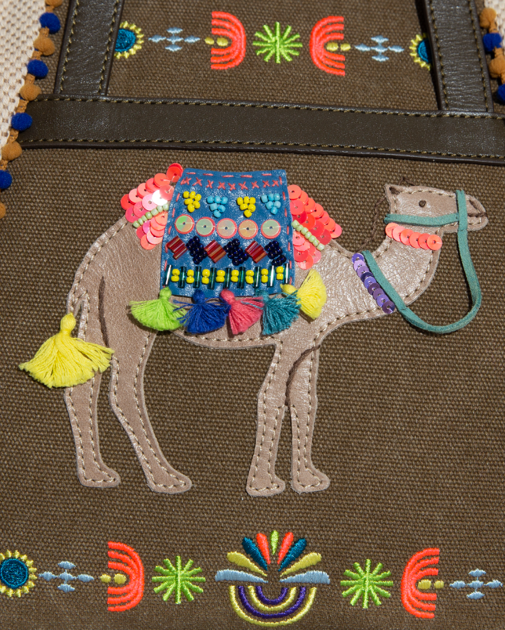 Inspired by bedouins and decorative camels as seen in ancient town of Petra, Jordan, our Camela Small Zippered Shopper is one that tells a wonderful story of these modern day nomads. The camel camel motif is beautifully crafted with beaded and tassels details and and detachable cross body strap makes it easy for you to take on every adventure.