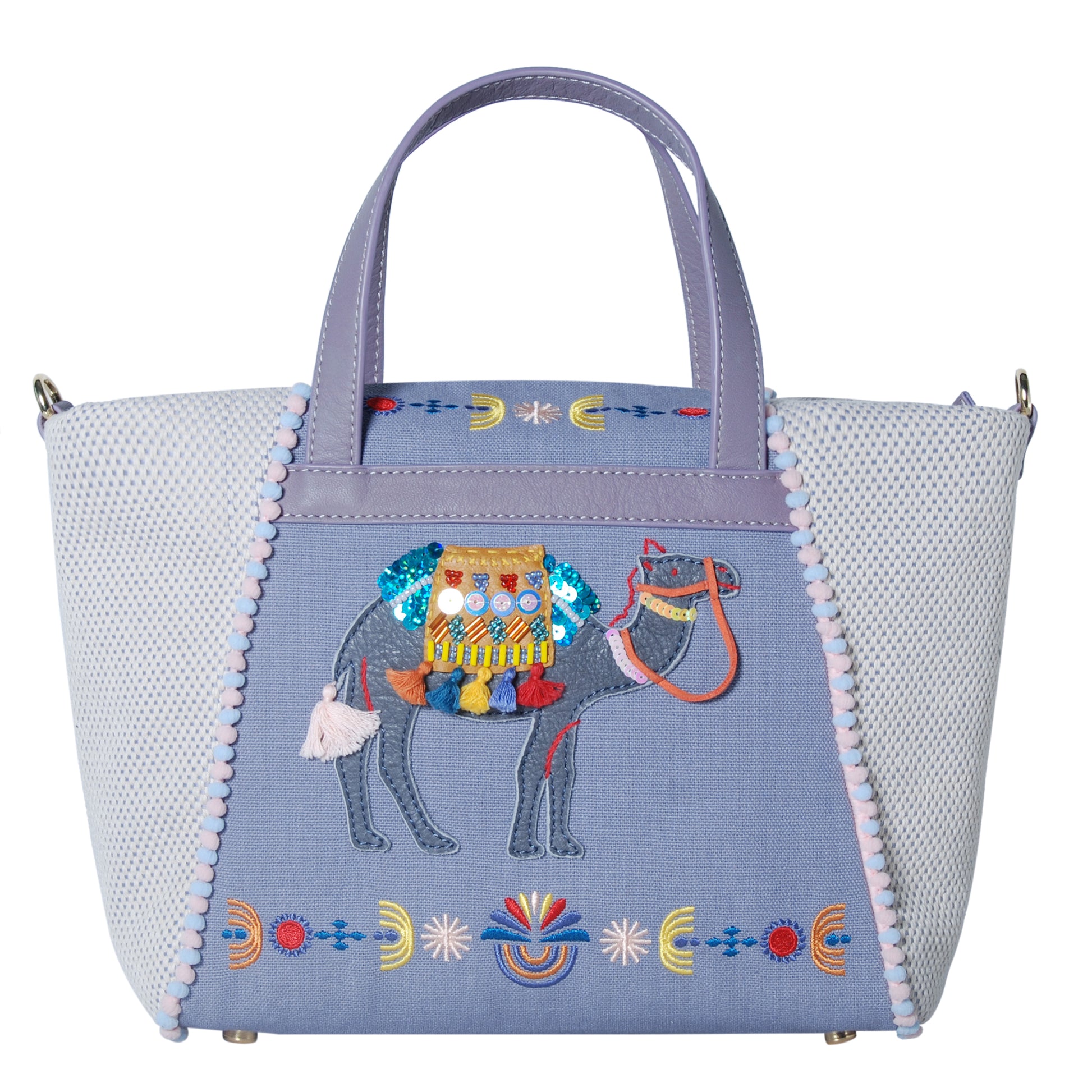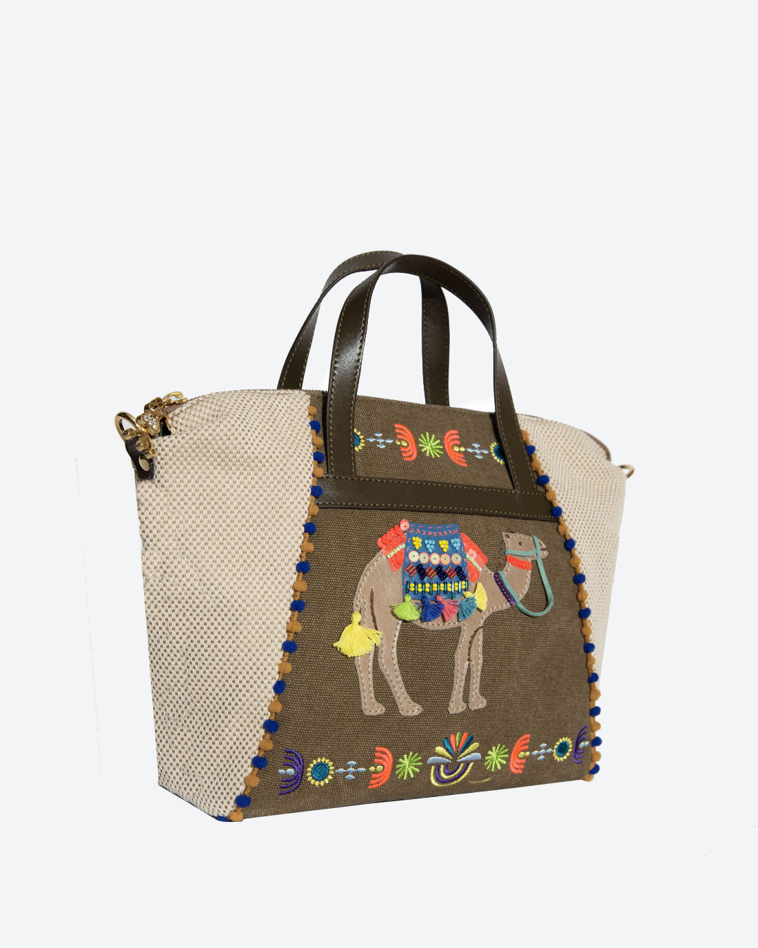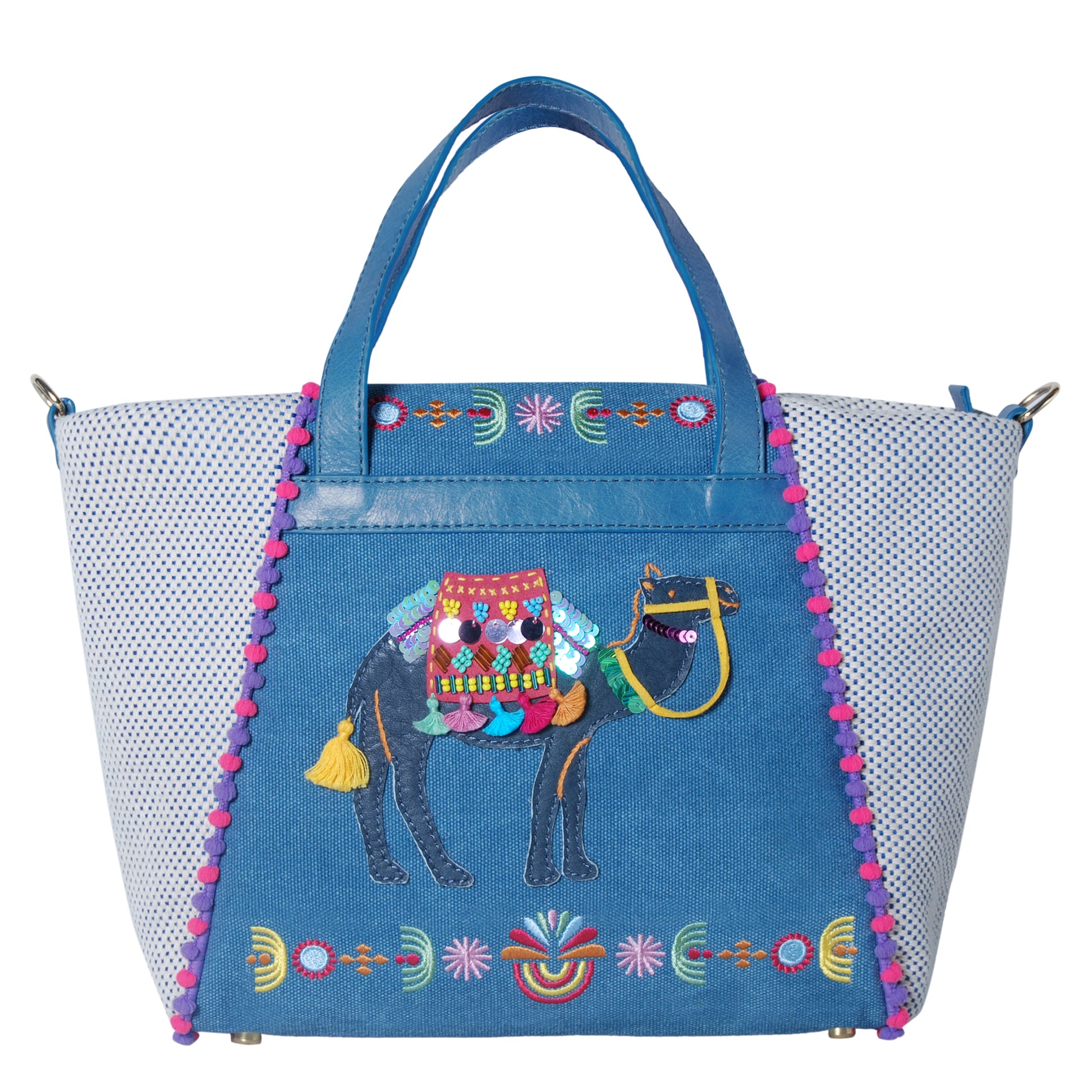 Inspired by bedouins and decorative camels as seen in ancient town of Petra, Jordan, our Camela Small Zippered Shopper is one that tells a wonderful story of these modern day nomads. The camel camel motif is beautifully crafted with beaded and tassels details and and detachable cross body strap makes it easy for you to take on every adventure.