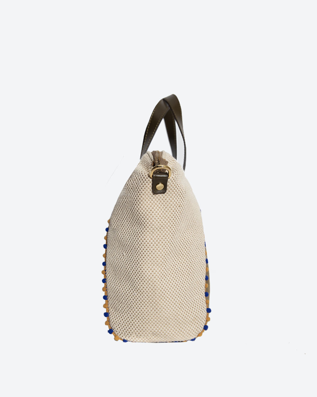 Made in Jacquard, cotton canvas with genuine leather trims and handles- it is very lightweight but roomy ( you can even fit an umbrella and your selfie stick in!) Small hidden pocket on the backside allows for easy access to phones and keys.