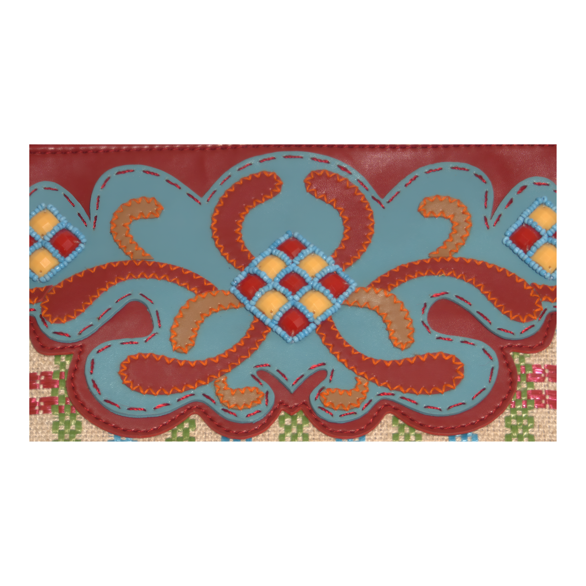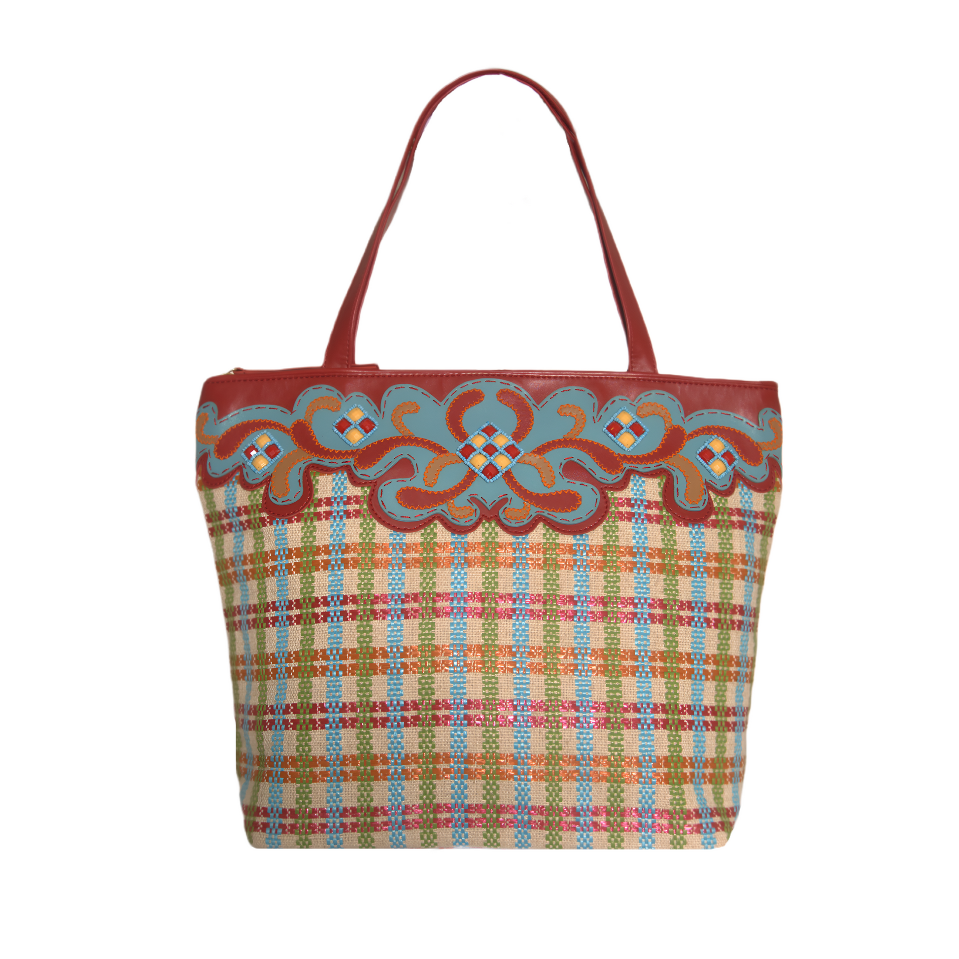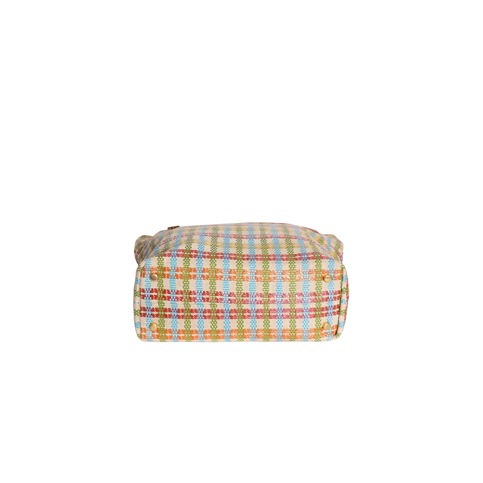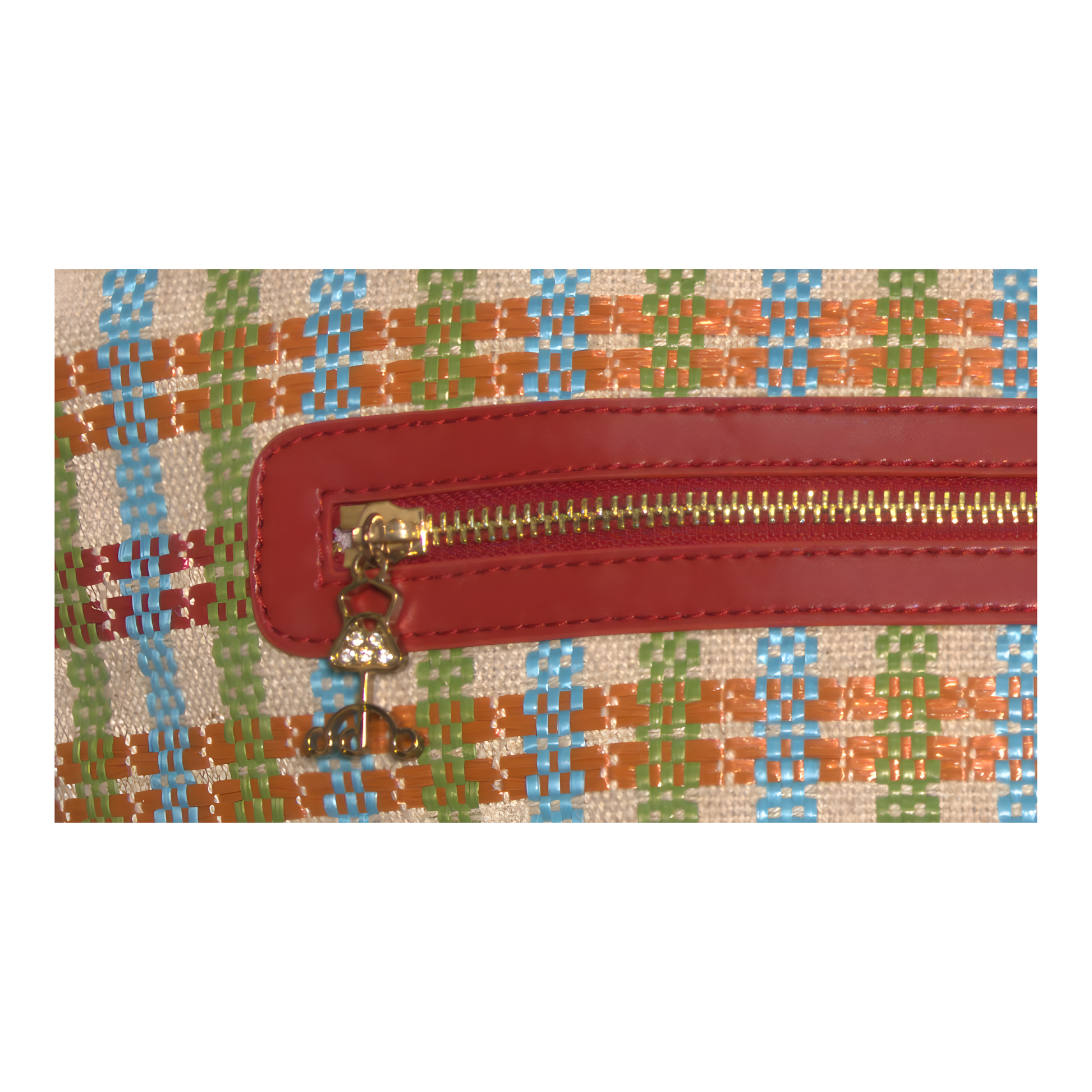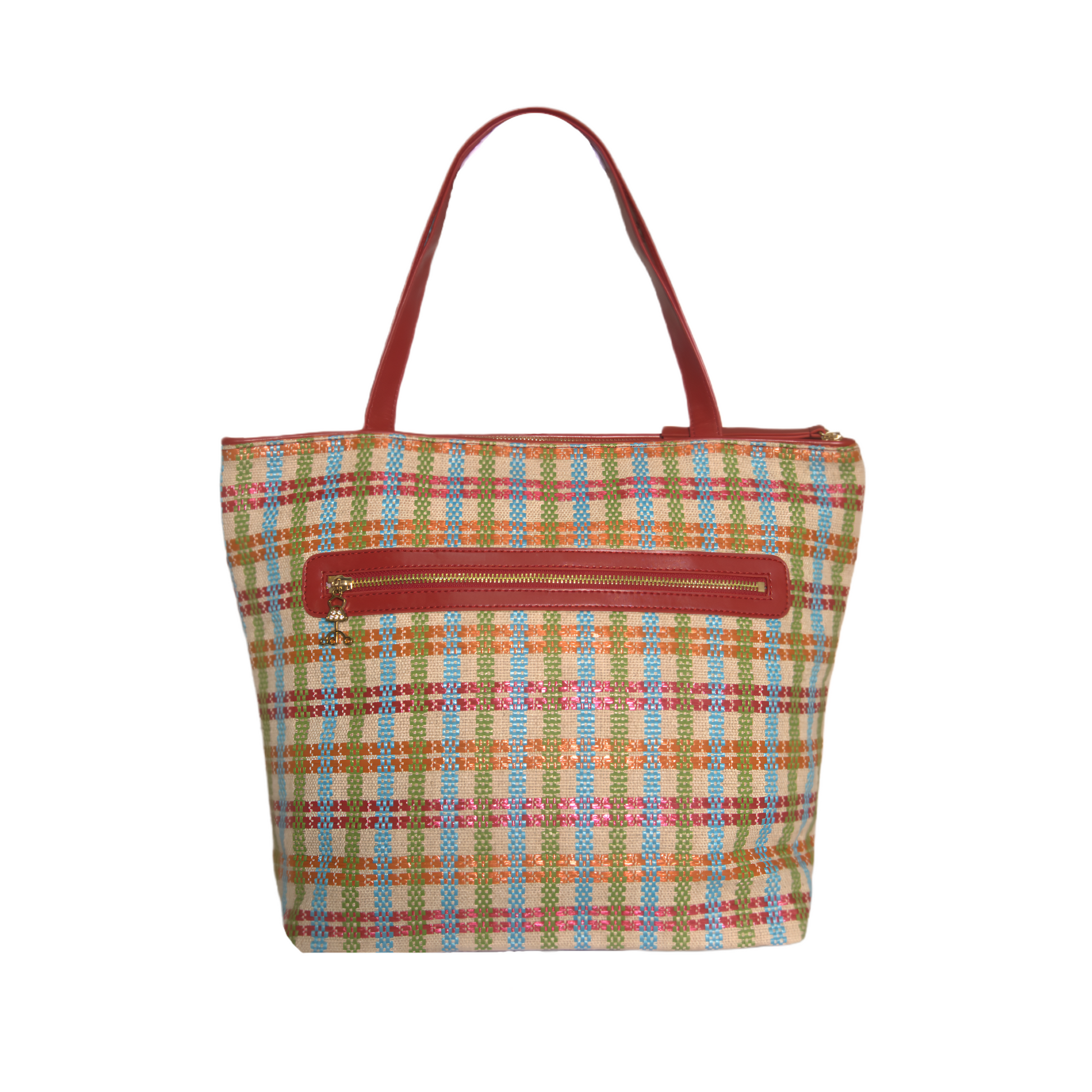 This stunning Cathay Raffia Tote is a spacious and functional tote bag crafted from durable poly raffia, featuring a chic tartan pattern. Whether you're heading to the beach or stepping into the office, this tote is the perfect companion with its convenient outside zip pocket and inside pocket designed to keep your phone and cash secure. The handmade beading and applique add a touch of elegance, while the easy-to-clean micro-fibre material ensures practicality ( and perfect for any vegans!). Elevate your style with the vibrant colors and unique design of this eye-catching tote, and make a statement with our Cathay Raffia Tote!