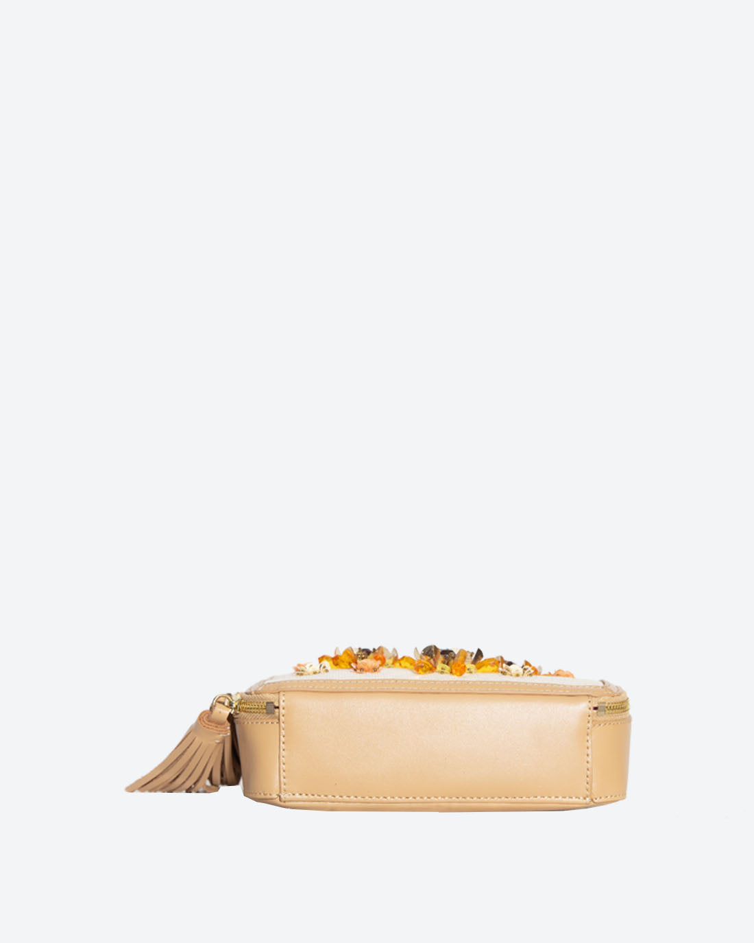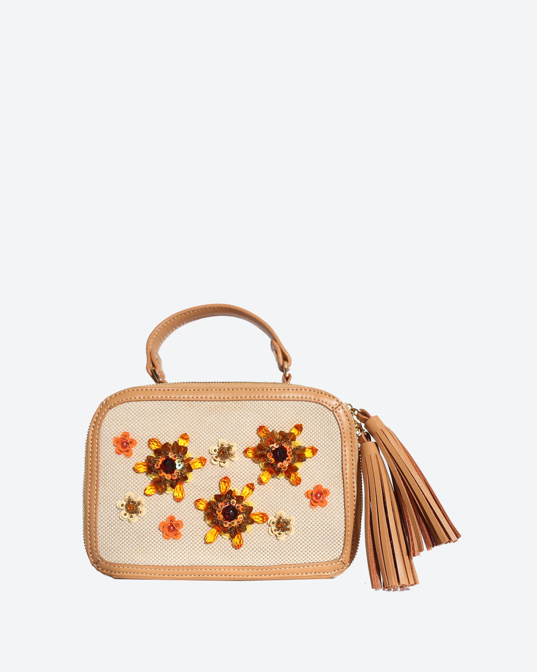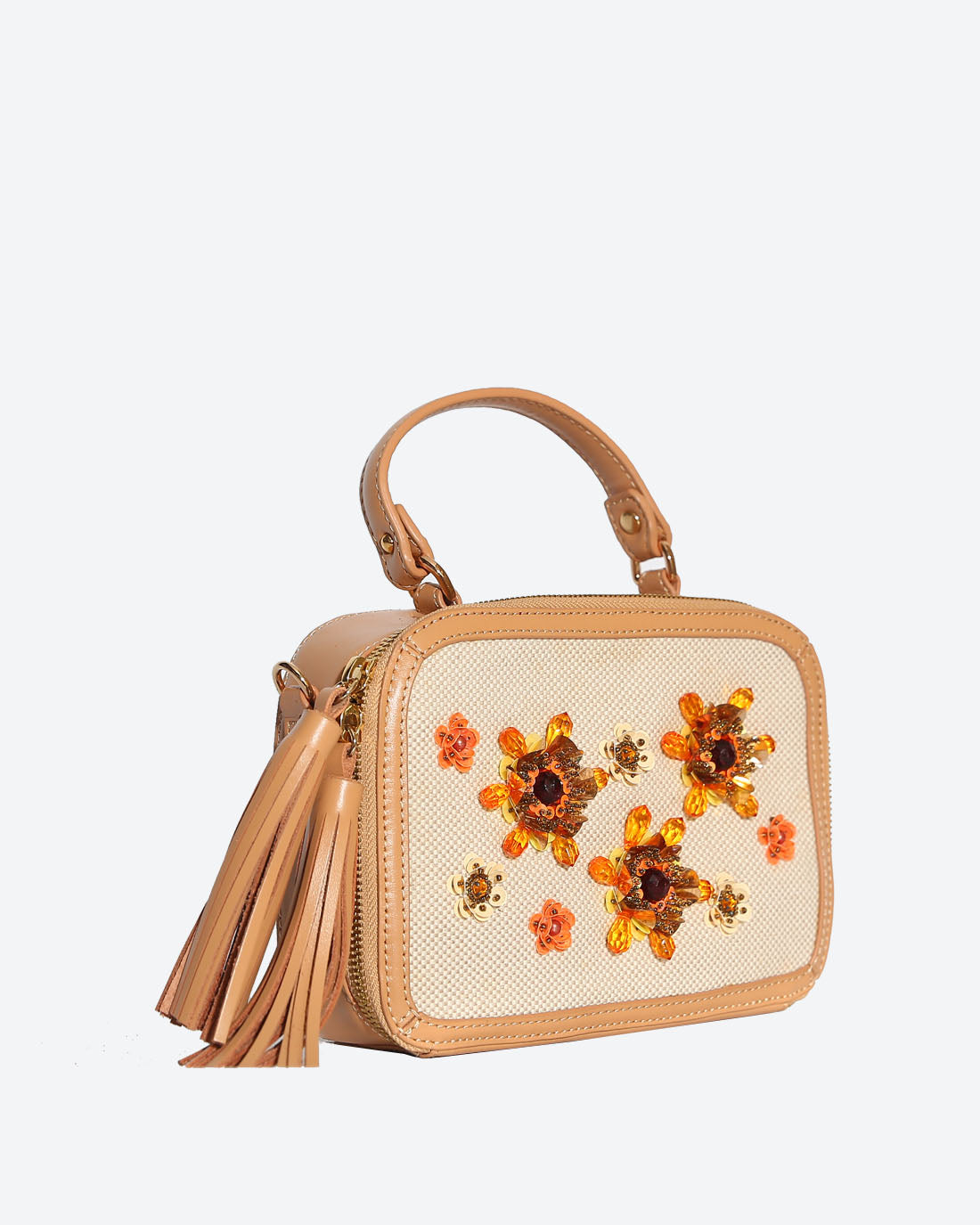 This mini box bag is a hit with our customers. Although small in size, it packs a punch with its roomy interiors, inside zipper pocket for cash, slip pocket for phone and a back zipper pocket for small essentials. The detachable crossbody handle adds versatility to be used as crossbody. This 2nd edition (1st edition was totally sold out) features handmade beaded 3D flowers and beautiful leather tassel pullers. A great bag that you can dress up and down with.