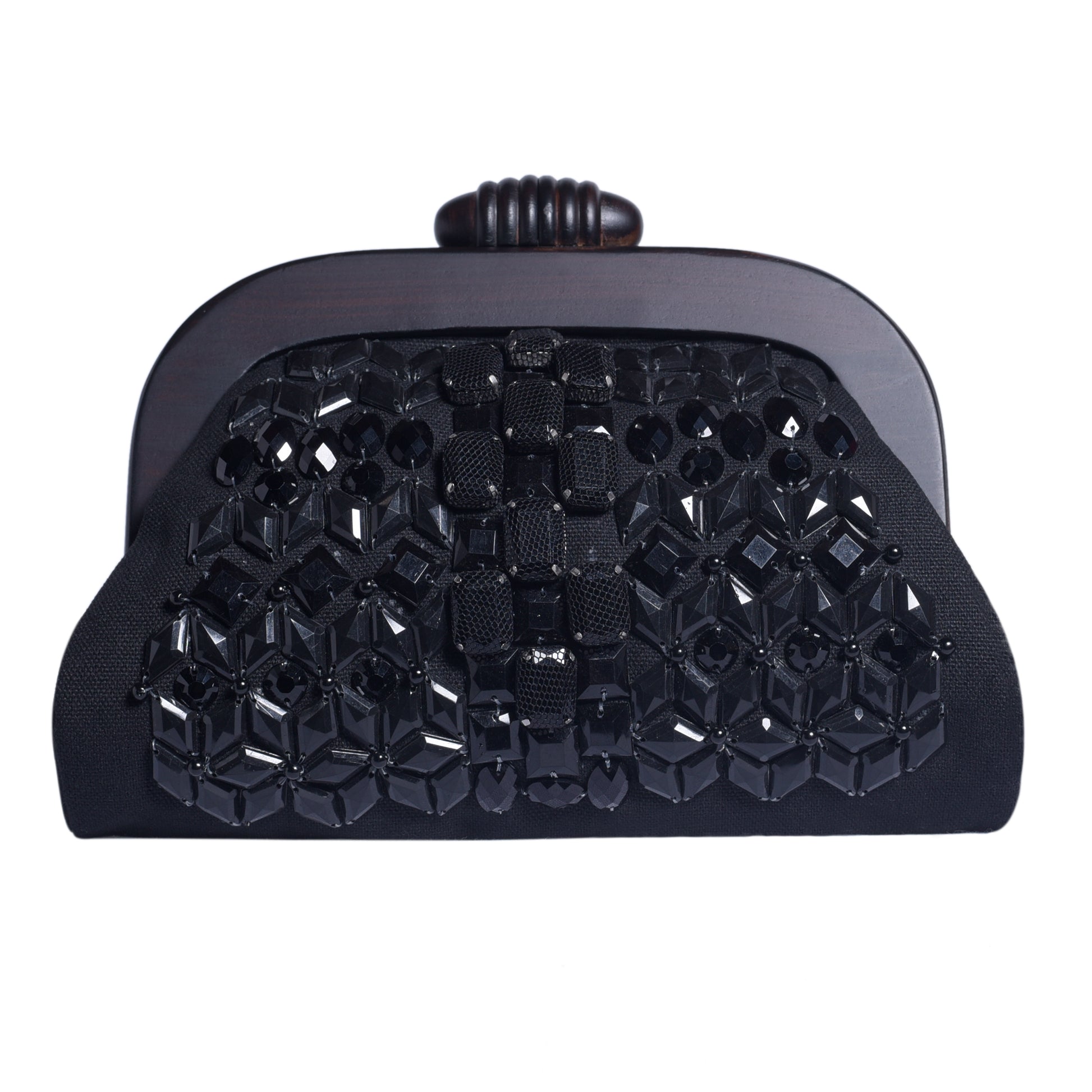 Like the LBD, this classy evening clutch is A Must-Have in your wardrobe. Hand-beaded with black rhinestones and jet beads, this is a great accessory for galas, cocktails or even casual dinners out. The hand-carved honeycomb wooden frame handle adds a unique spin and the zippered interior pocket ensure that your cash, credit cards are secured. The mesh details on the rhinestones ensure that the beads will not be caught with your gorgeous fine outfits like knits etc.