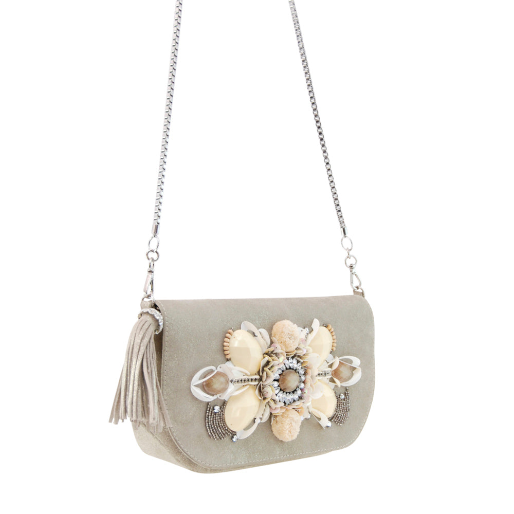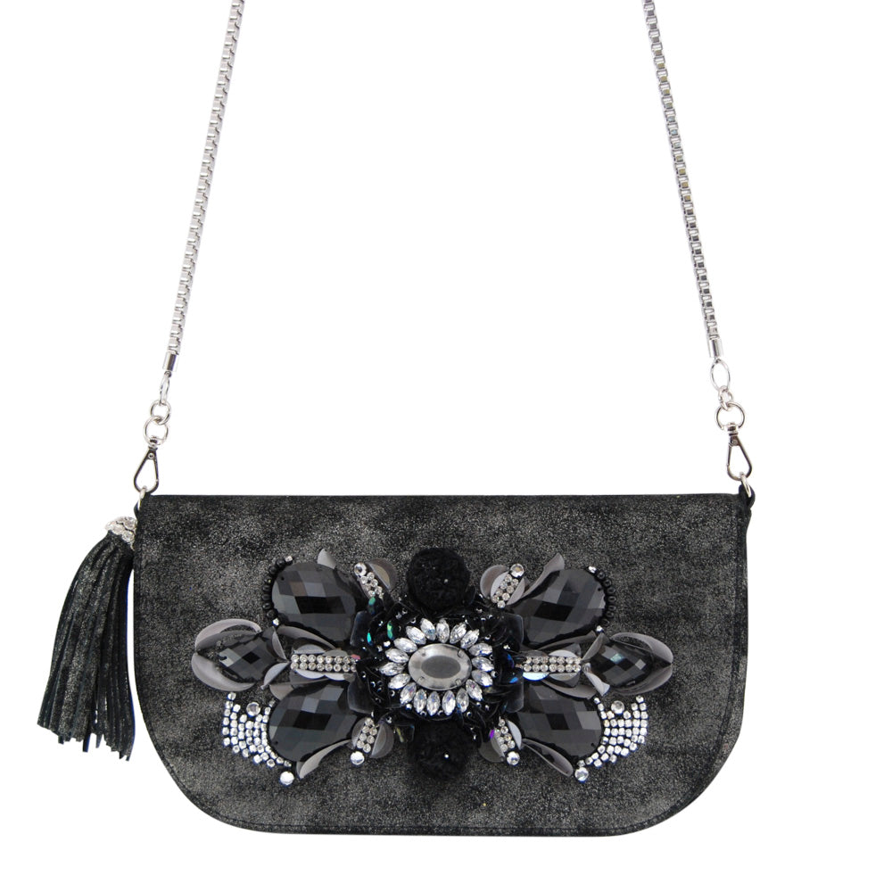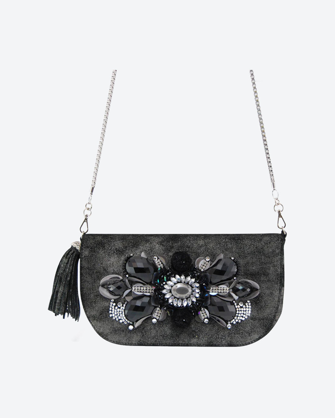 A bold statement in every stitch, our Pendula Bag is a wearable masterpiece. Crafted in distressed metallic suede and adorned with hand-applied embellishments—crystal-like gems, rudraksha beads, and intricate embroidery—this bag is designed for those who dress to express.