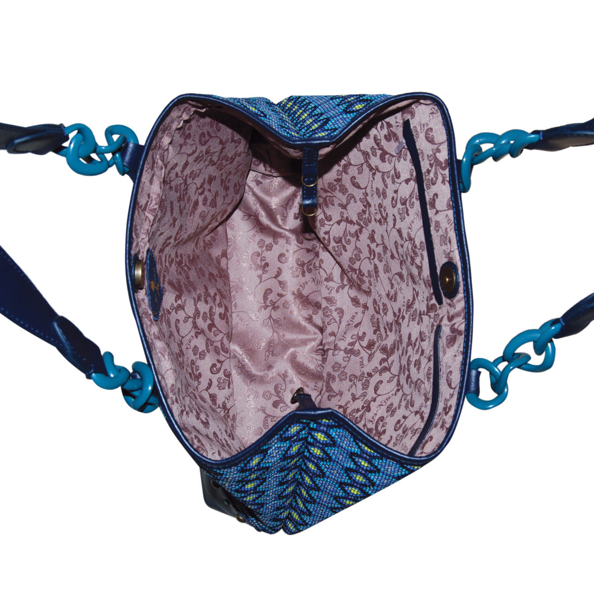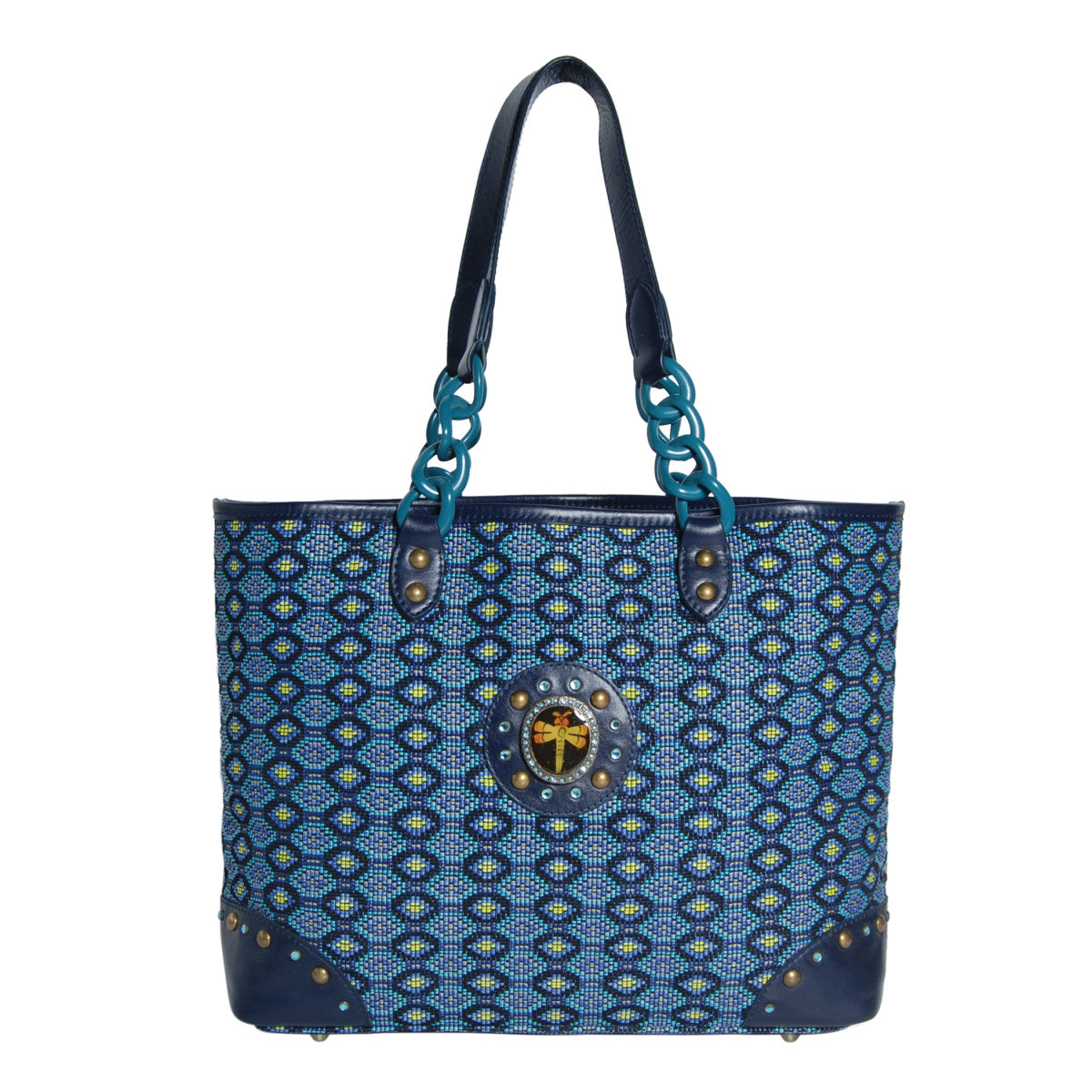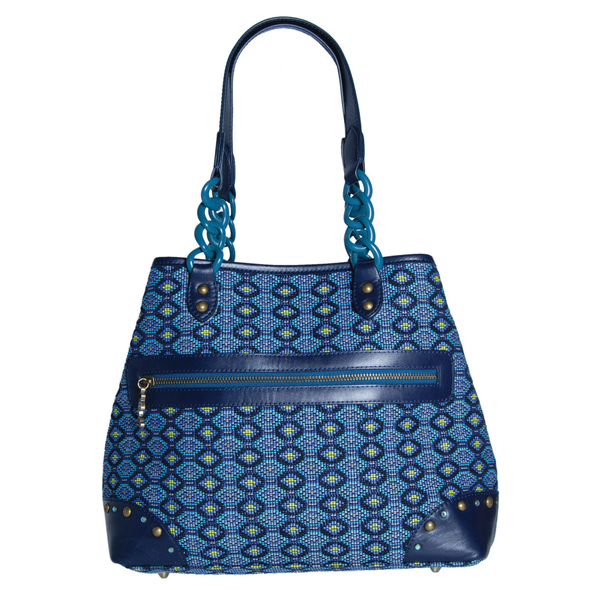 Introducing our Mauri, this medium tote can effortlessly elevate your style game. Made in a captivating blue patterned poly raffia, this bag is anything but ordinary. Its slightly water-repellent fabric keeps your belongings safe and dry. Crafted with genuine leather trims and handles, it exudes luxury and durability. With a roomy interior featuring a zipper backside pocket, wallet compartment, and slip pockets for your essentials, it's the epitome of functionality. But what truly sets Mauri apart is its custom-made brooch decoration, adorned with rhinestone studs, adding an intriguing touch to your ensemble. Get ready to turn heads with this stunning shoulder bag. Upgrade your accessory game with our Mauri Tote today!