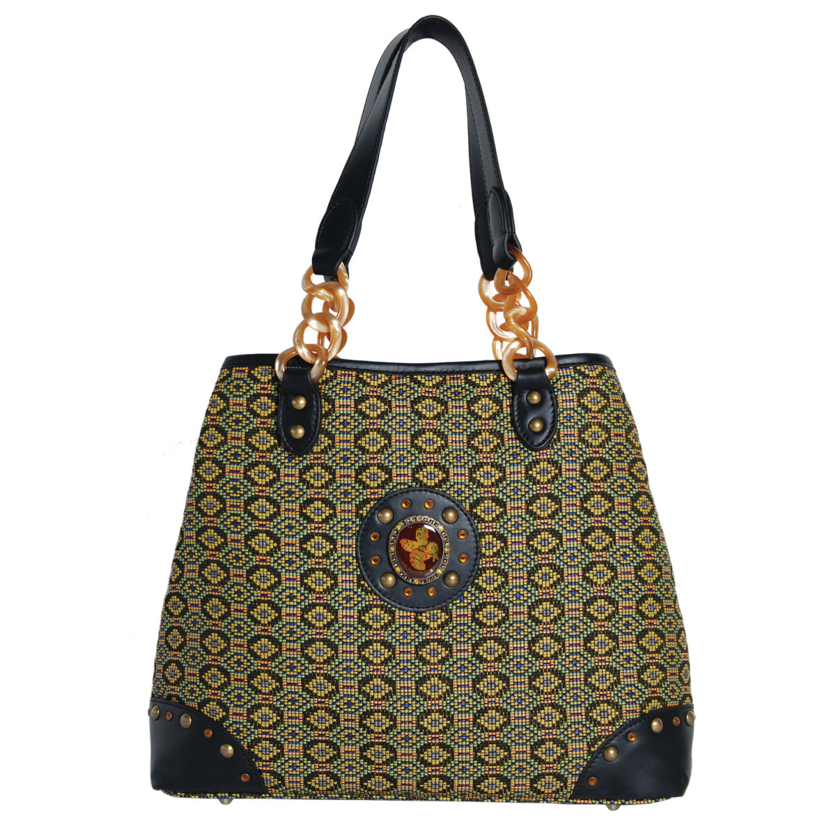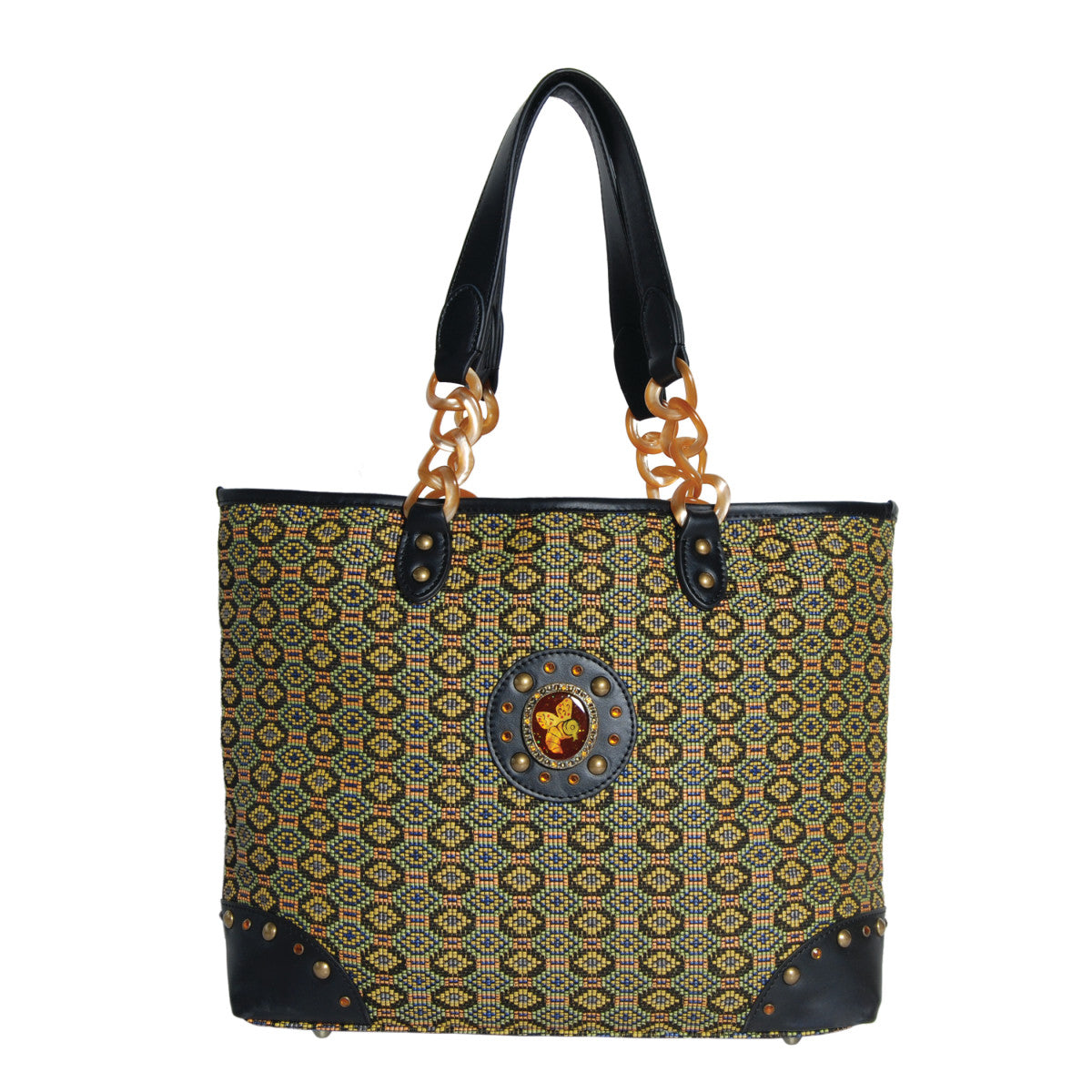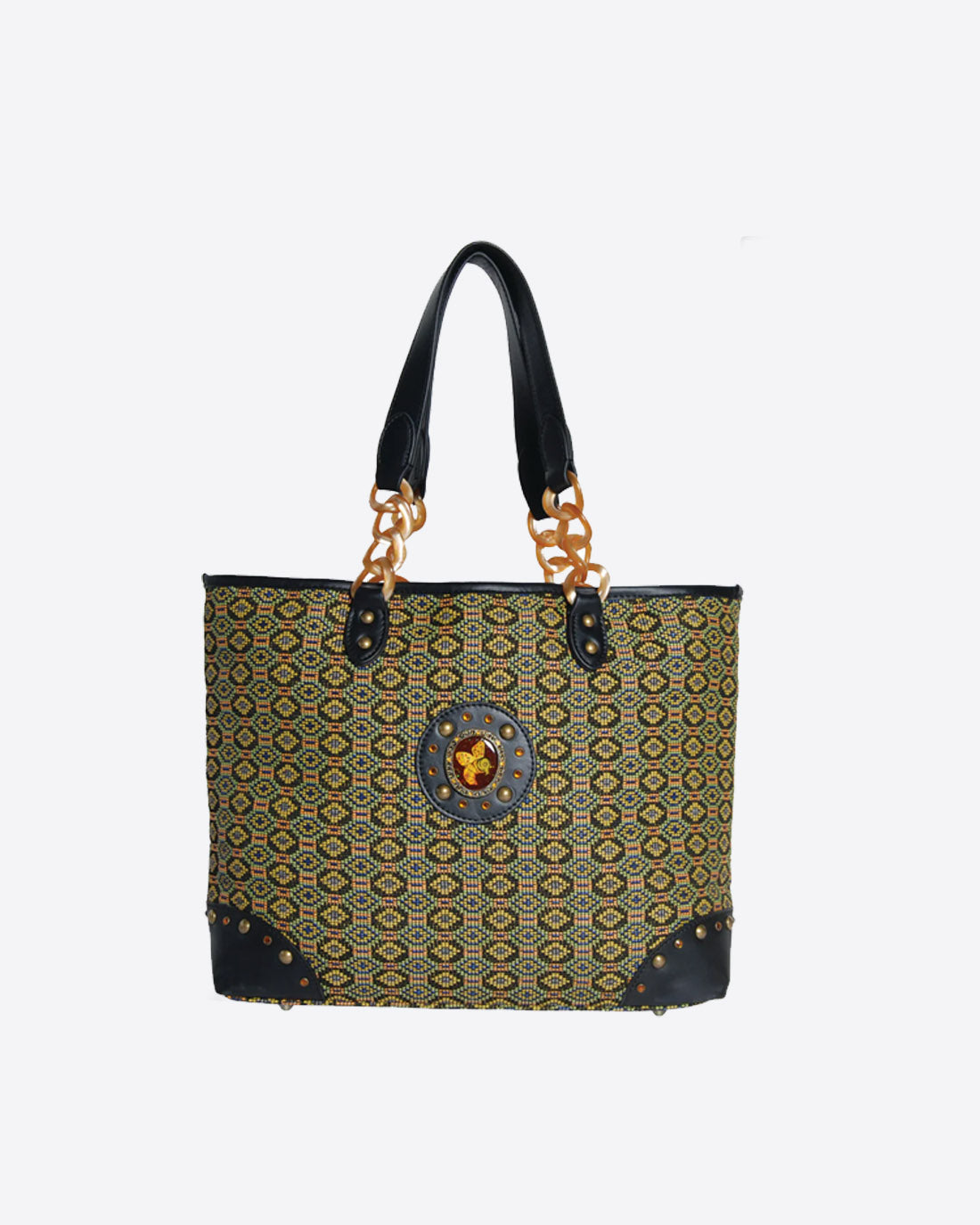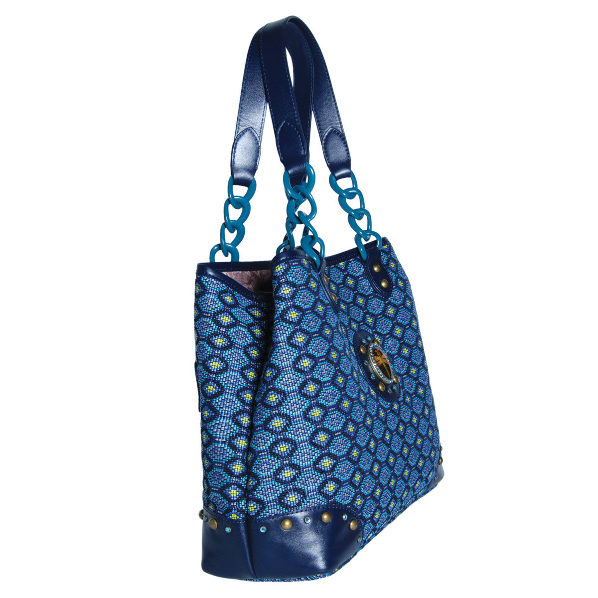 Introducing our Mauri, this medium tote can effortlessly elevate your style game. Made in a captivating blue patterned poly raffia, this bag is anything but ordinary. Its slightly water-repellent fabric keeps your belongings safe and dry. Crafted with genuine leather trims and handles, it exudes luxury and durability. With a roomy interior featuring a zipper backside pocket, wallet compartment, and slip pockets for your essentials, it's the epitome of functionality. But what truly sets Mauri apart is its custom-made brooch decoration, adorned with rhinestone studs, adding an intriguing touch to your ensemble. Get ready to turn heads with this stunning shoulder bag. Upgrade your accessory game with our Mauri Tote today!