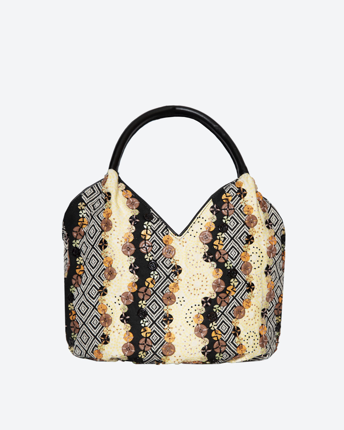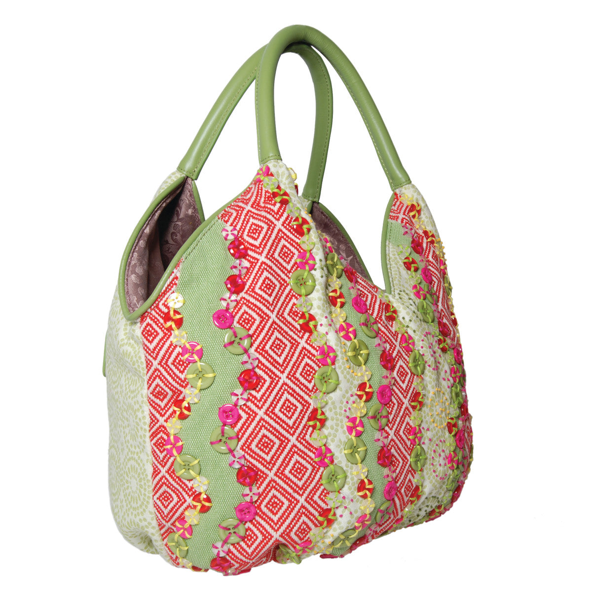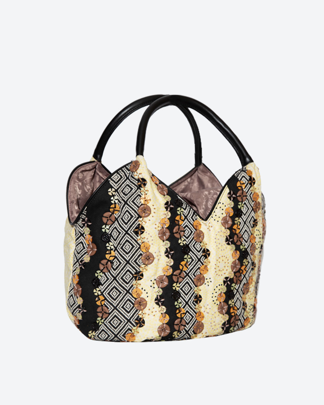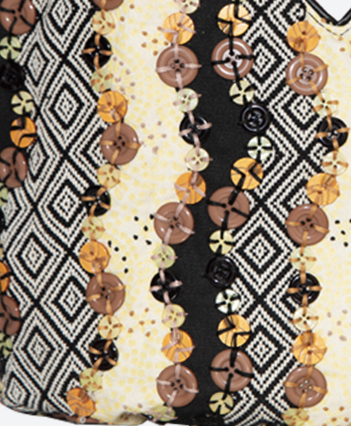Chúng tôi nổi tiếng với sự chỉnh trang của mình và chiếc bucket này có tất cả. Điều làm cho nó thú vị là các nút sáng bóng tương phản với vải jacquard. Mỗi nút được khâu bằng tay bằng chỉ cotton và thêu tay. Tay cầm và các chi tiết trang trí đều được làm bằng da thật, hoàn chỉnh với túi trượt ở phía sau để đựng tất cả các vật có giá trị của bạn.