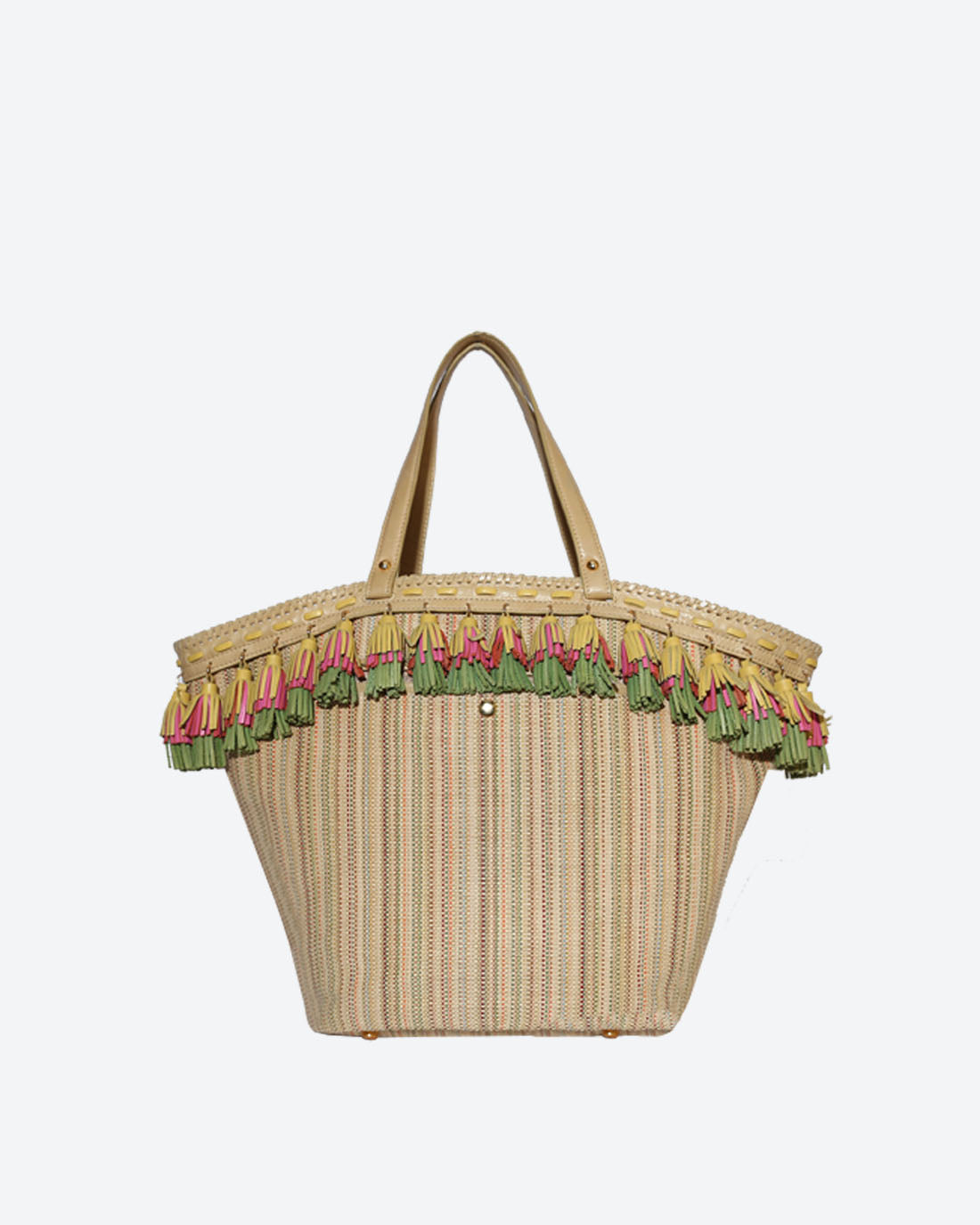 Chiếc giỏ Gaura này thật sự là 1 chiếc giỏ bãi biển độc nhất đảm bảo thu hút mọi ánh nhìn trên bờ biển. Kiệt tác đầy tinh xảo này không phải là chiếc giỏ thông thường - nó là 1 lời khẳng định cho sự tao nhã và độc đáo. Được may với sự chú ý tỉ mỉ trong chi tiết, chiếc giỏ Gaura đính kèm với hơn 30 núm tua chạy dọc theo túi, trong khi những chi tiết bông tai được thêu thủ công tạo 1 nét đặc biệt độc đáo. Với thiết kế rộng rãi, nút thắt đóng túi, và cấu tạo chắc chắn, chiếc túi này là sự lựa chọn hoàn hảo cho bất kì trang phục đi biển nào. Đựng được tất cả những món đồ cần thiết - khăn tắm, sách, máy tính bảng, kem chống nắng và tạp chí - không tốn chút công sức nào. Hãy sẵn sàng để tạo nên sự khác biệt với chiếc túi thủ công xinh đẹp, phi thường này